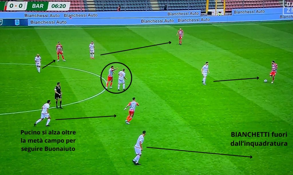 Parlavamo dell’aggressività richiesta da Longo in fase di non possesso, ed effettivamente quando chiamata ad alzarsi sui riferimenti avversari il Bari è una squadra rognosa, difficile da affrontare. I problemi affiorano quando i biancorossi sono costretti a difendere ad altezze diverse. Il blocco basso del Bari è tutt’altro che ermetico, spesso la squadra si sfilaccia, le distanze tra i reparti si dilatano e gli avversari hanno gioco facile.