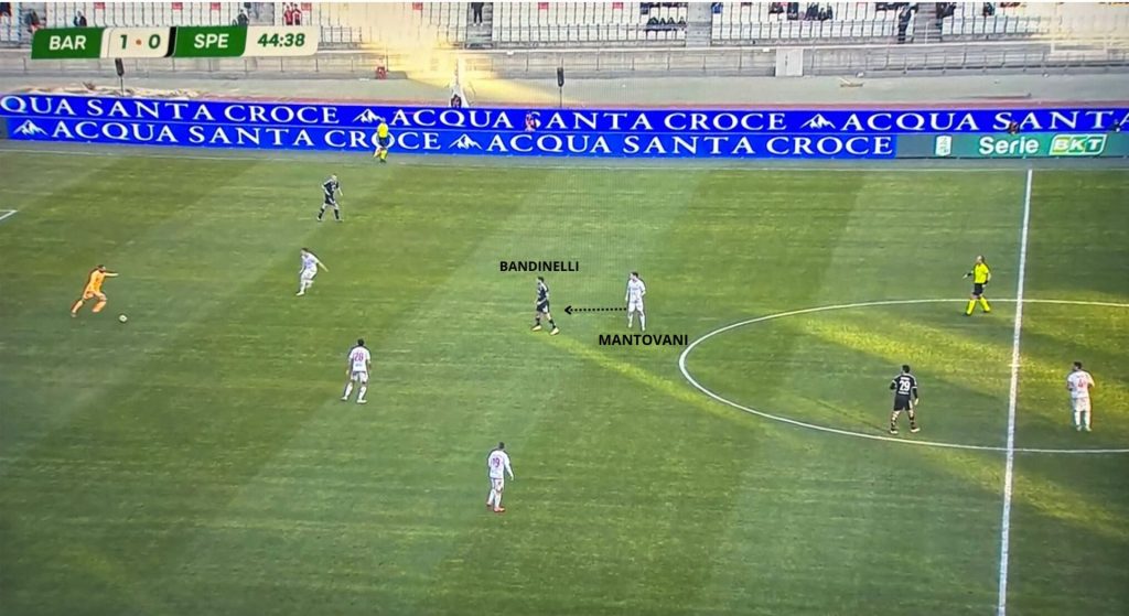 Il principio cardine del gioco di Longo è proprio questo: impedire all’avversario di imporre il proprio gioco disturbandolo anche nella propria area. Per farlo il Bari punta forte sulla pressione uomo su uomo e sui duelli a tutto campo finalizzati ad impedire all’avversario di pensare e giocare in libertà. Quindi, non stupisce più vedere Mantovani seguire il proprio riferimento nella metà campo avversaria, né tantomeno Falletti o Sibilli abbassarsi a ridosso della difesa per assorbire il movimento del difensore a loro assegnato.