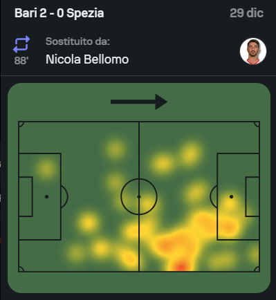 Come evidenziato dalla heatmap della sua partita, Lella ha agito prevalentemente sul centrodestra, con 50 tocchi di palla e una precisione dei passaggi sul 76%. Statistica senza dubbio migliorabile, cosi come anche la percentuale dei duelli fisici a suo vantaggio, ossia il 30%. Nel turno precedente col Palermo, aveva raccolto ben 7 duelli vinti, 2 tiri bloccati e un salvataggio. Al netto di alcuni numeri da ritoccare verso l’alto, come ad esempio una maggiore incisività negli ultimi trenta metri, la prestazione complessiva di Lella è stata indubbiamente positiva, in quanto può rappresentare una base di partenza per un inizio di 2025 da protagonista in biancorosso.