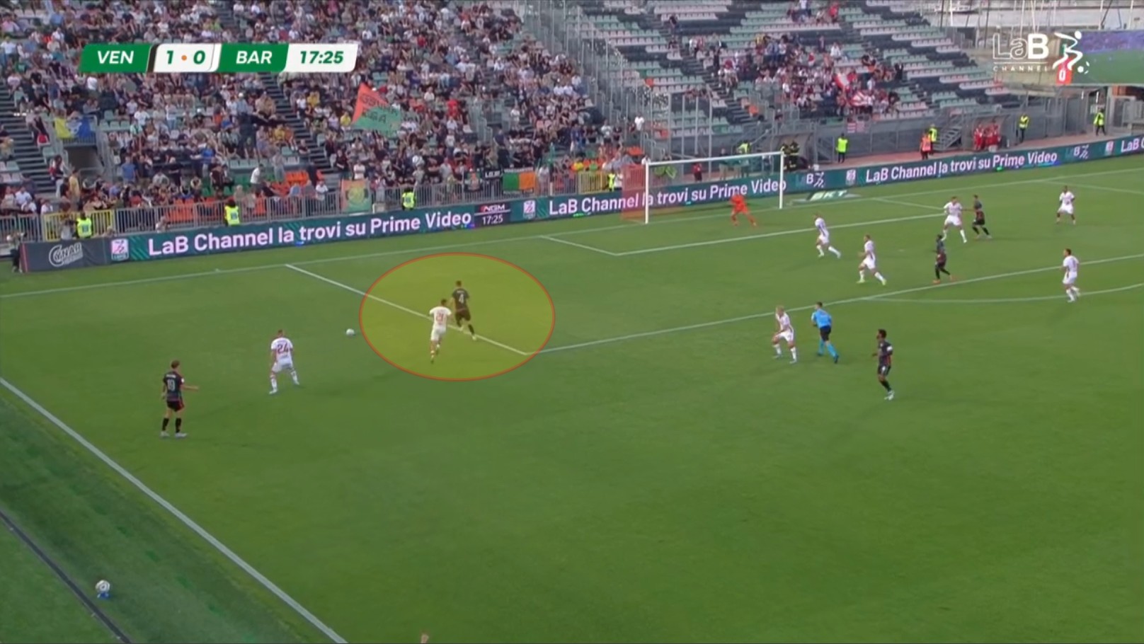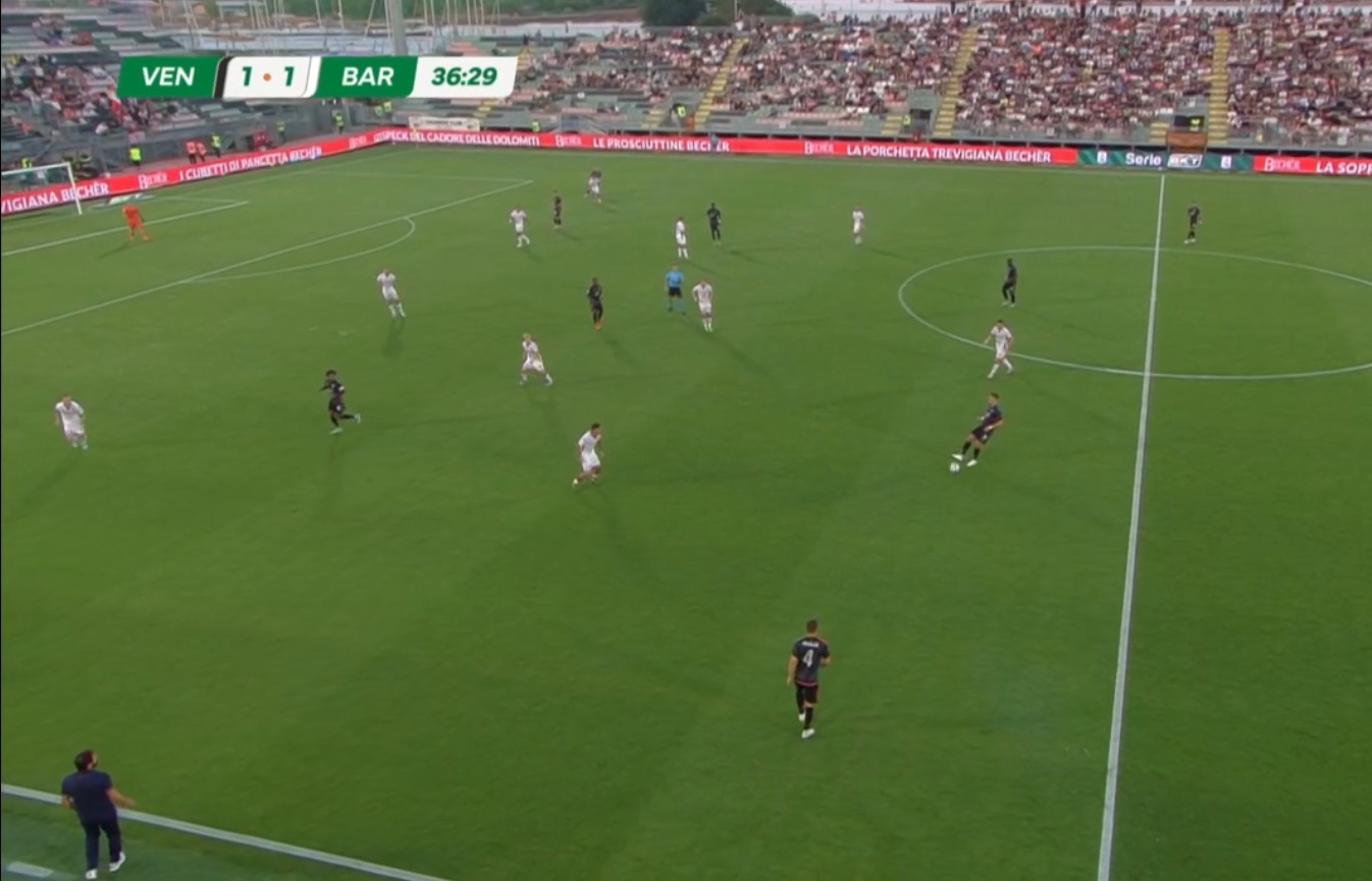 Nella prima mezz’ora Stroppa ha puntato soprattutto ad aprire spazi centrali, costringendo il Bari ad allargarsi e lasciando così varchi da attaccare. Già in fase di impostazione i tre braccetti si disponevano molto larghi e, in alcune situazioni, anche Stankovic partecipava alla costruzione per permettere a Schingtienne di spingere a destra, con Hainaut pronto a proiettarsi in avanti. Le difficoltà maggiori per i biancorossi sono emerse quando il Venezia ha allargato il gioco nella metà campo offensiva, in particolare a sinistra: Bjarkason restava quasi sulla linea laterale, obbligando Dickmann a uscire largo, mentre Busio si muoveva molto sulla fascia e in avanti. Se Braunöder lo seguiva, Yeboah sfruttava il varco centrale con i suoi movimenti a rientrare; se invece restava in posizione, i padroni di casa trovavano spazio per costruire azioni pericolose in zone cruciali del campo.
