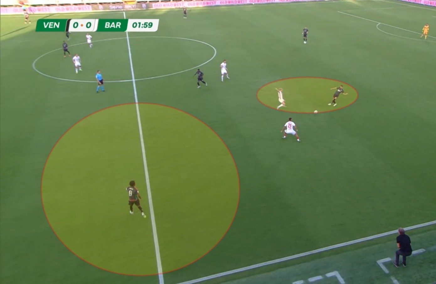 Per tutta la prima frazione, i movimenti dei lagunari — mezzali che si allargavano, braccetti in sovrapposizione, attaccanti pronti a venire incontro — hanno costretto un centrocampo biancorosso non al meglio della condizione a coprire porzioni ampie di campo. Risultato: il Venezia ha spesso trovato superiorità numerica sia al centro che sulla corsia mancina, mettendo in seria difficoltà i galletti e arrivando più volte con tanti uomini al limite dell’area.