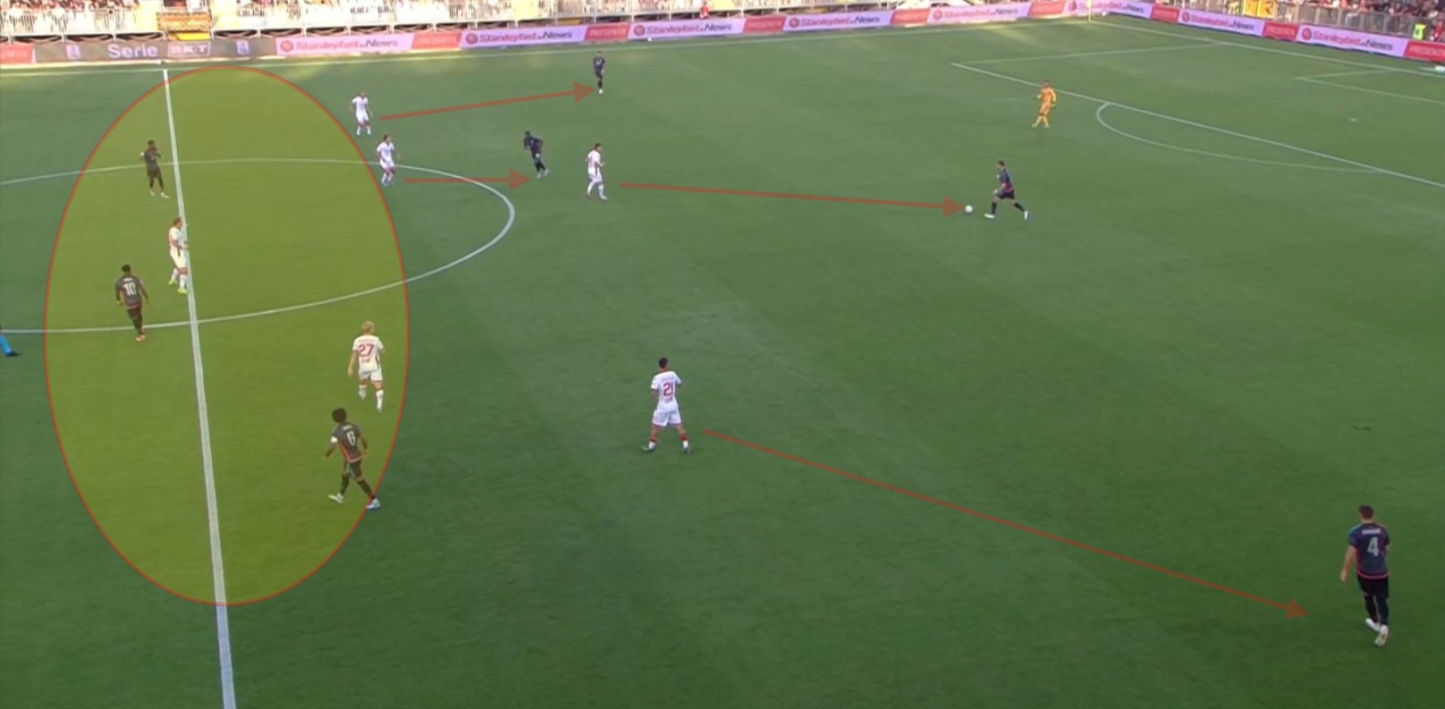 Se è giusto sottolineare le difficoltà in avvio, a Caserta va dato il merito di aver saputo leggere la partita e trovare delle buone contromisure. Una delle prime mosse è stata abbassare leggermente il baricentro, chiedendo a Partipilo di arretrare qualche metro in fase di non possesso. In questo modo l’esterno ha dato una mano preziosa nella copertura delle zone che avevano fatto soffrire la squadra nel primo tempo, garantendo maggiore equilibrio e solidità difensiva.